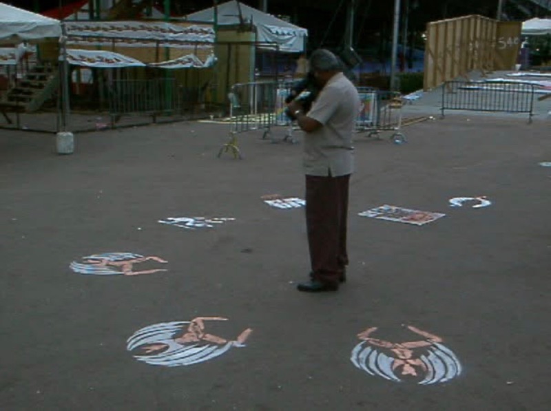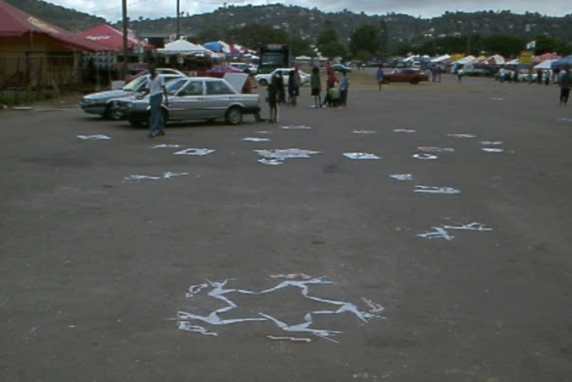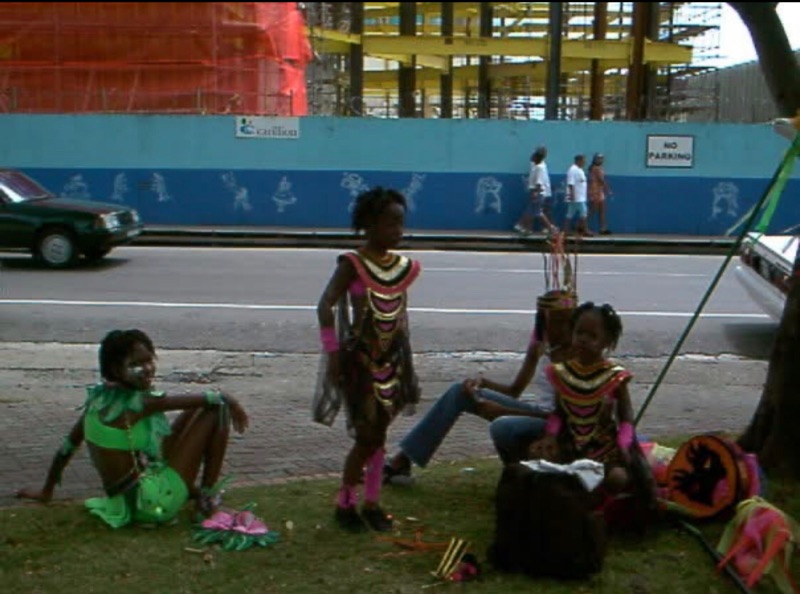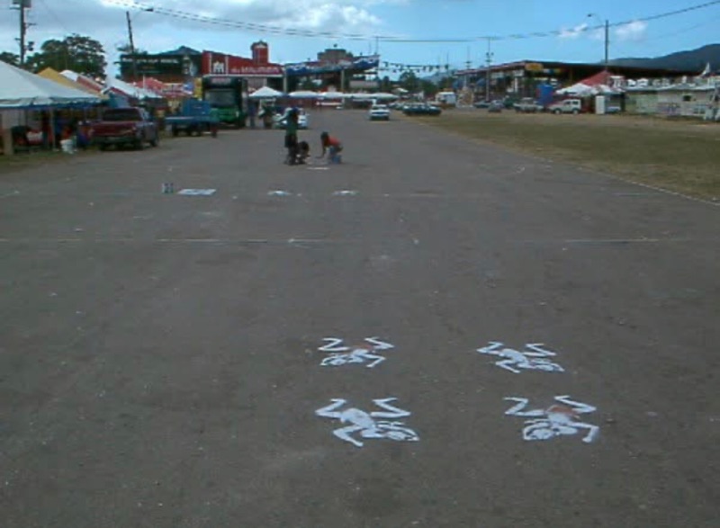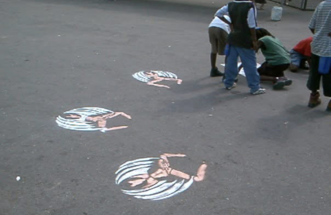 Back in Port-of-Spain in the light of day it was interesting to see the stencils on public spaces amidst the colorful costumes, passers by, vendors, stray dogs, homeless people et al. Carnival as a two day event is transitory. The stencils are also. I was very curious about the life and energy of the images that meant a past history in a present space with its own future disappearance lodged eventually as a vague memory.