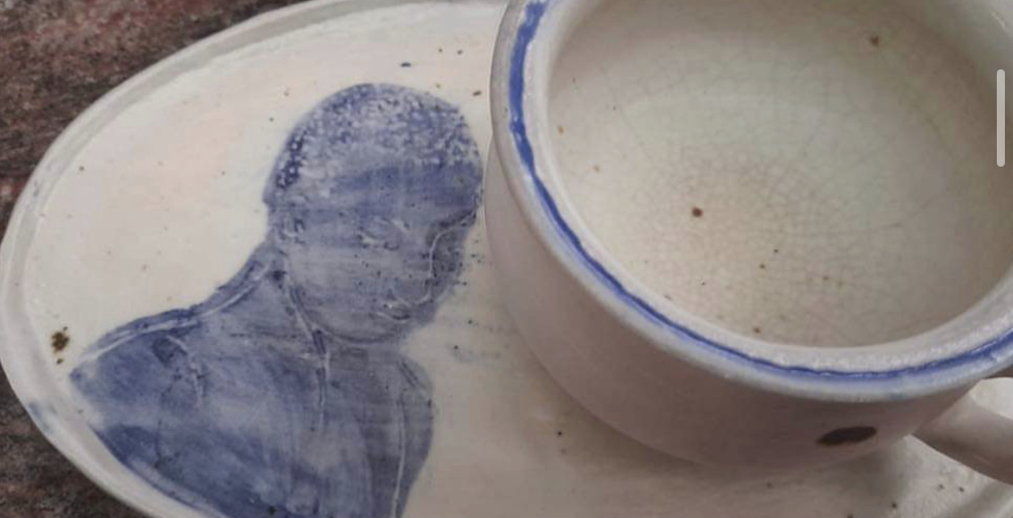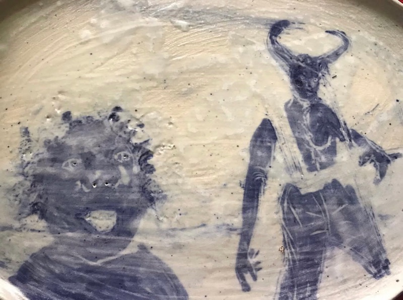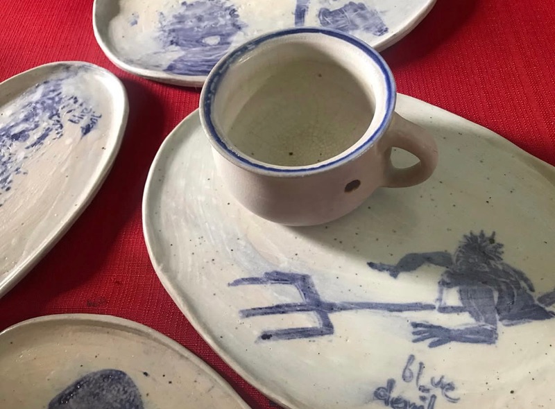 I finally found Greta Joachim. Her studio is filled with bowls, plates, jugs - and she serves everything she offers on her gorgeous wares. It was love at first sight when I drew out my images and then took the trip to see her space to then draw, score, puncture and texturize the plates. I also got the added bonus of buying a few of her pieces too.