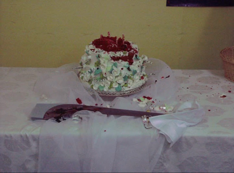 Then, suddenly I paused and revealed a huge hooked cutlass that was hidden under my veil. I then cut the cake, much to the viewers surprise.