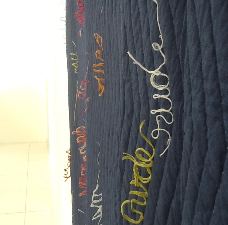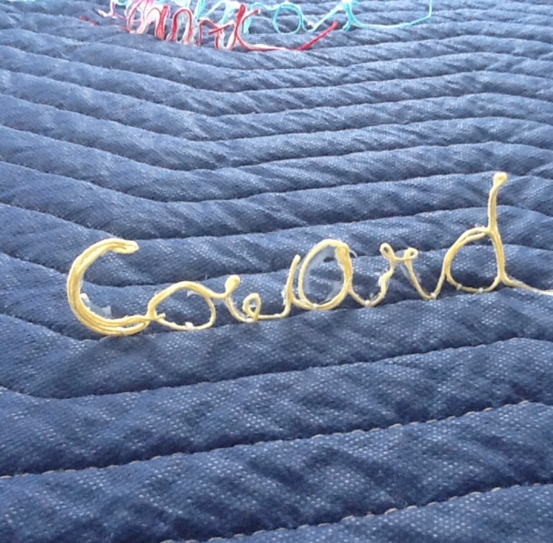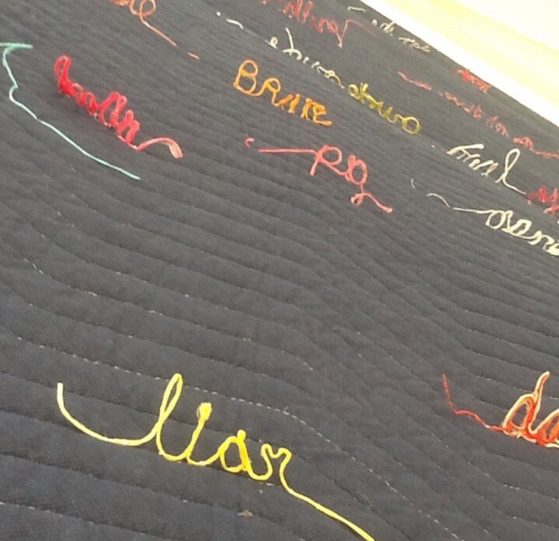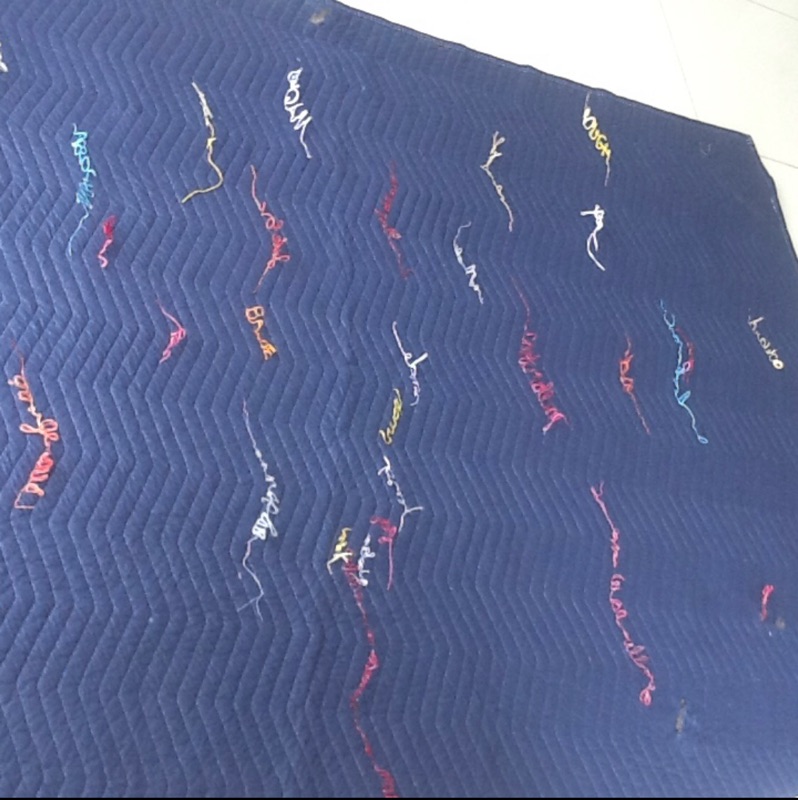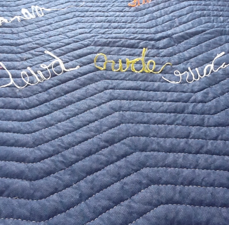 This is an interactive work. The viewer must move their bodies to ‘read’ the piece. The quilt is a symbol of nurturing, safety and warmth. The loose threads symbolize the unraveling of that safety. We generally expect men to be ”men” with all that is implied. Both historically in Literature and the Arts a man is portrayed as physically strong and a provider and protector of women and children. This plays into our psyche’s so deeply that for many, we are completely unaware of how much our stereotyping of the male sex confuses boys as they grow to manhood. I hope that my piece shall inspire those who interact with it. I also hope that by viewing the individual words that one will take the opportunity to consider when they themselves have perhaps used terminology seen on the quilt or words to that nature to define a man’s character. We are all guilty of a level of sexual politics for its own gain and must now consider that sensitivity is not a one way street.