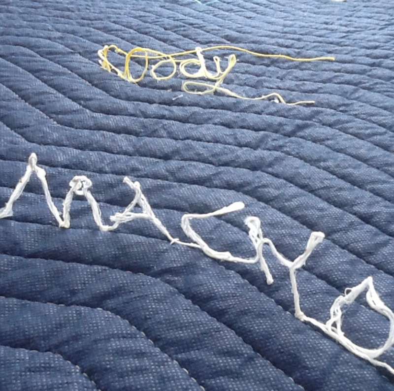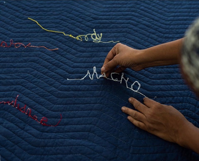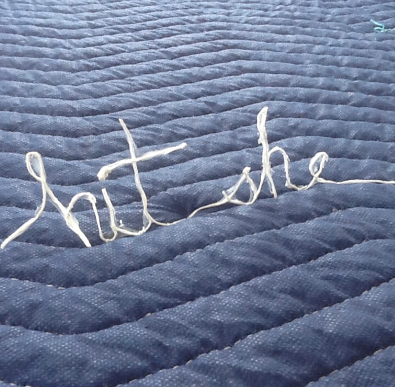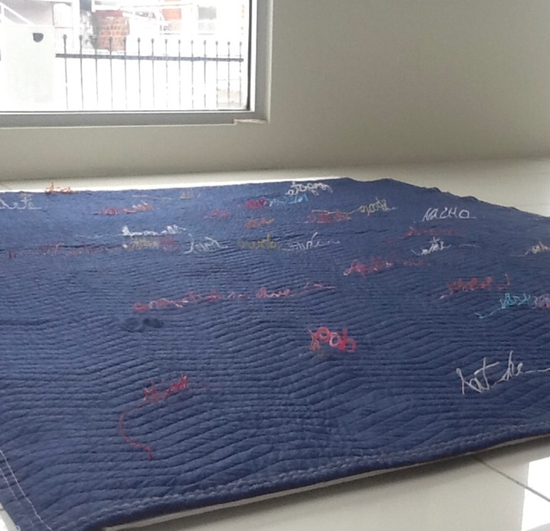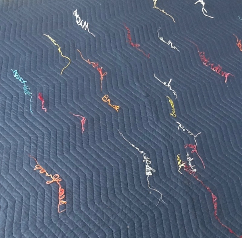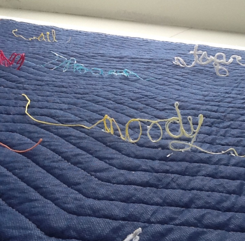 This is an interactive work. The viewer must move their bodies to ‘read’ the piece. The quilt is a symbol of nurturing, safety and warmth. The loose threads symbolize the unraveling of that safety. We generally expect men to be ”men” with all that is implied. Both historically in Literature and the Arts a man is portrayed as physically strong and a provider and protector of women and children. This plays into our psyche’s so deeply that for many, we are completely unaware of how much our stereotyping of the male sex confuses boys as they grow to manhood. I hope that my piece shall inspire those who interact with it. I also hope that by viewing the individual words that one will take the opportunity to consider when they themselves have perhaps used terminology seen on the quilt or words to that nature to define a man’s character. We are all guilty of a level of sexual politics for its own gain and must now consider that sensitivity is not a one way street.