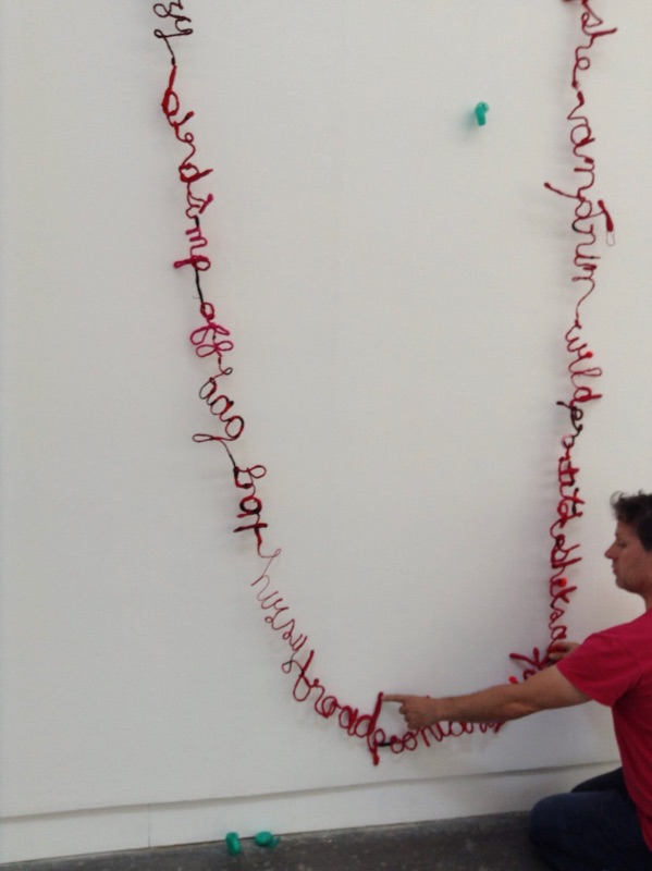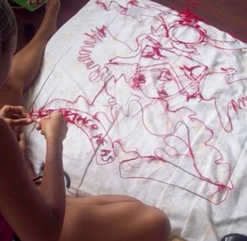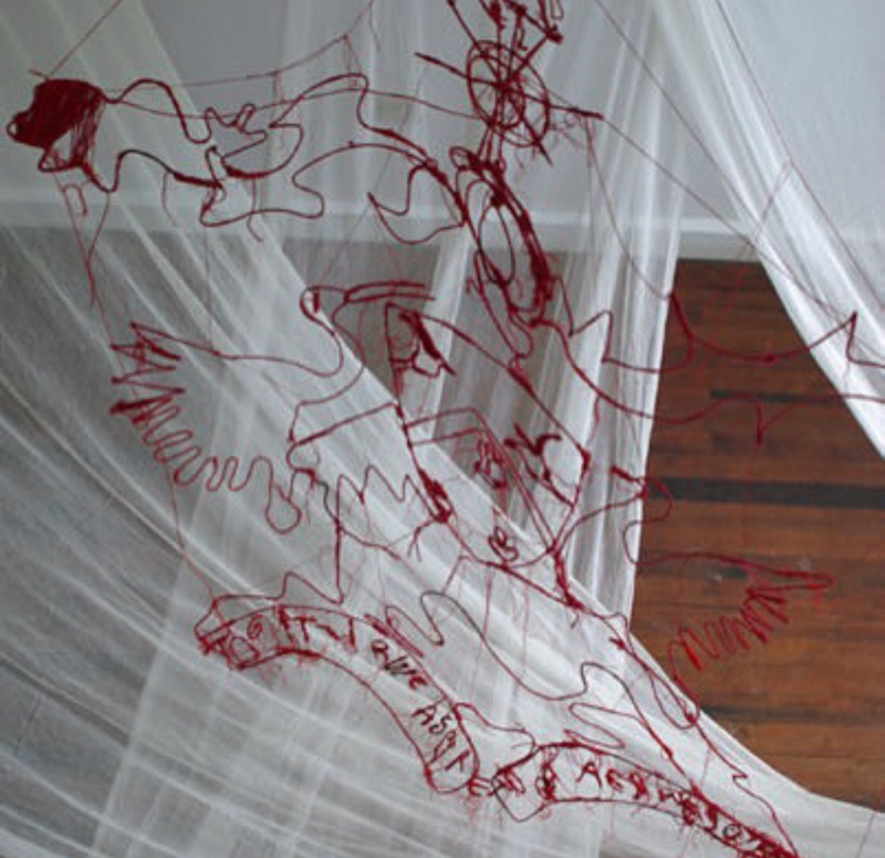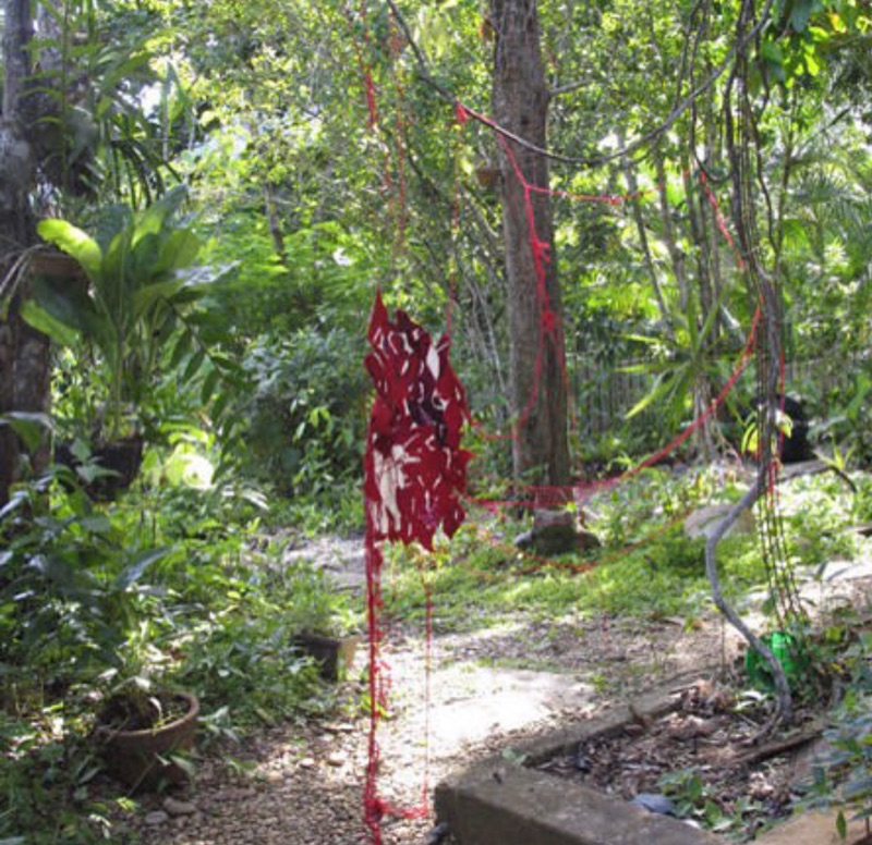 This environmental embroidery focuses on the contradiction of the wild Anthuriums in the forest ( shaped like hearts) and the color of blood - morphing into the shapes of gunmen who hide amongst the lush foliage. Long strands of red threads anchor the piece and dimensional embroidered letters form the words that suggests the sound of gunshots- pax, pax and dhow, dhow.