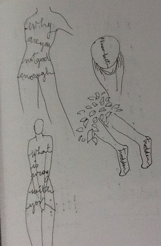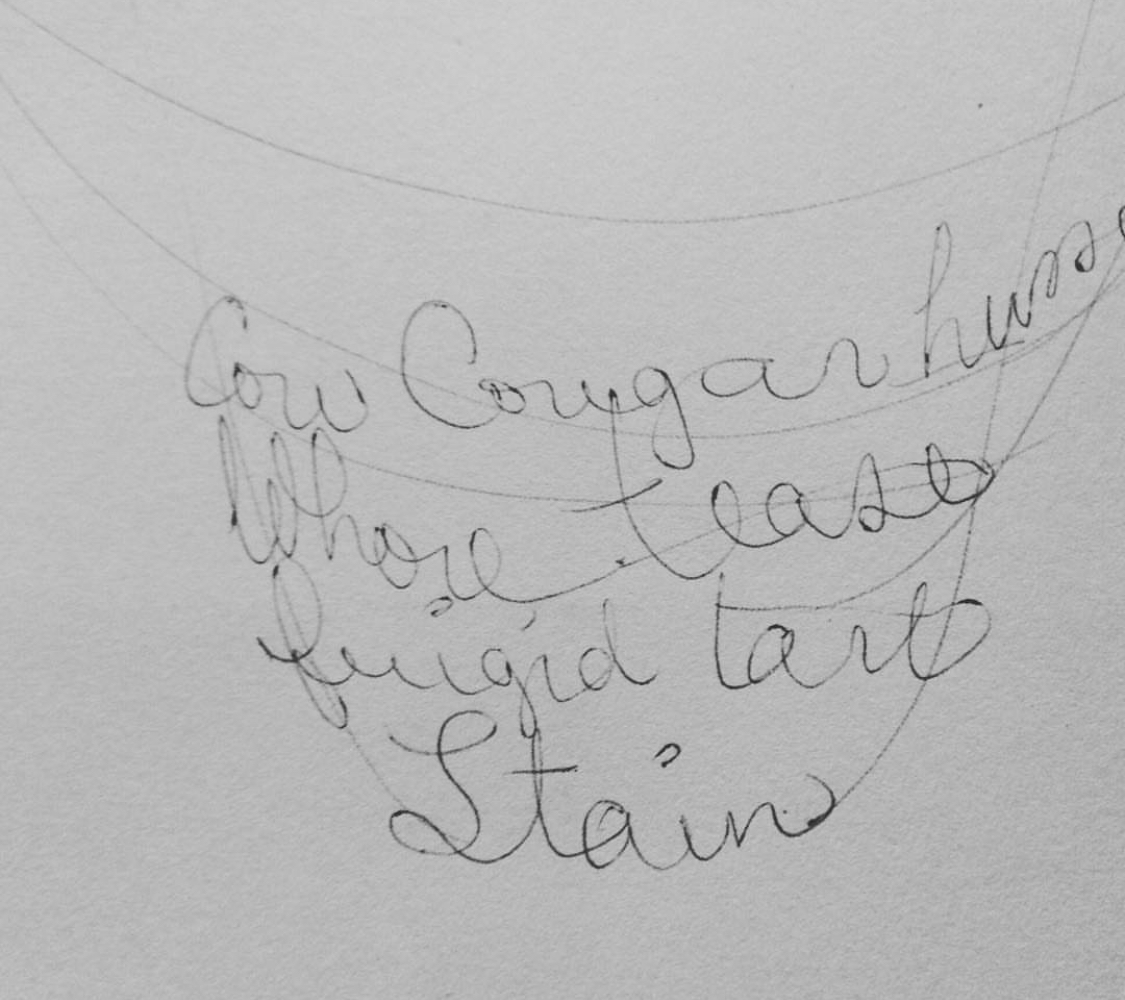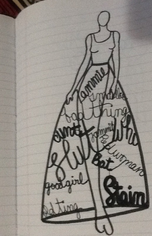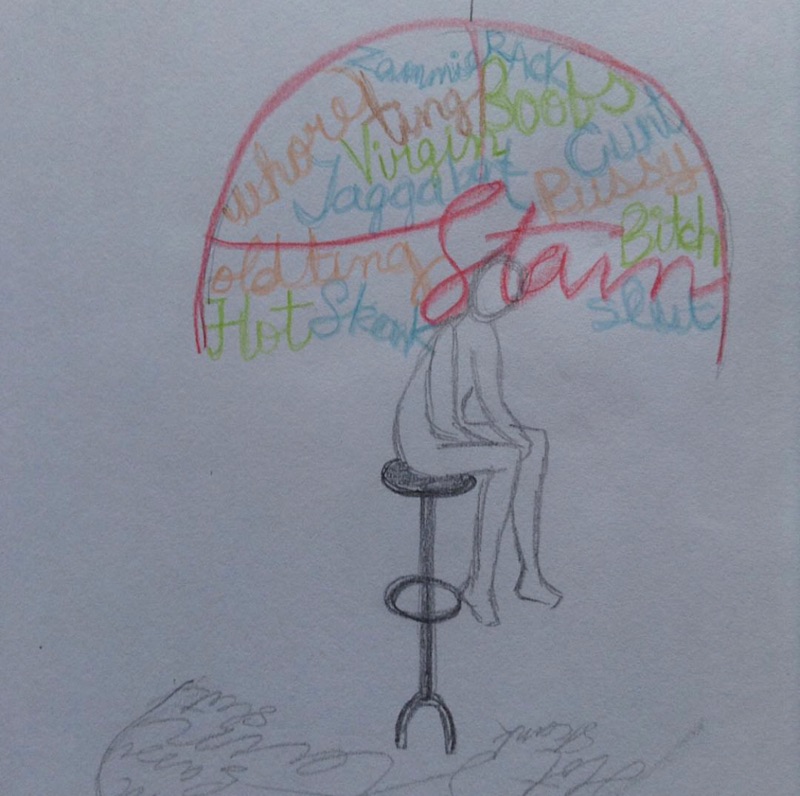 early sketches for STAIN one has to look up at the playful, brightly colored canopy of words - a reflective moment between the viewer and the installation - unbeknownst to the viewer of this piece, as you stand reading each unkind name that women have been called, the canopy casts a shadow over you - so that you become swept into the very reading of the work - thus becoming STAINed.