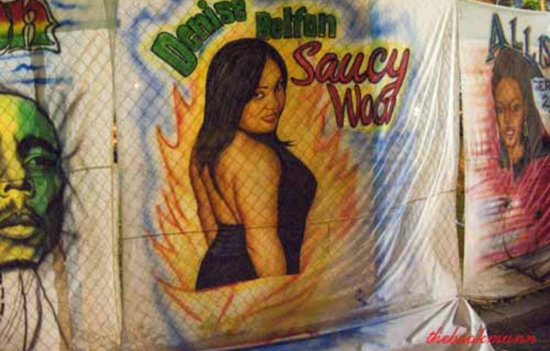 Airbrush imitation imagery - a style first seen in African American and Hispanic American inner cities. Denyse Belfon our Saucy Wow as she is known in the Soca fraternity.