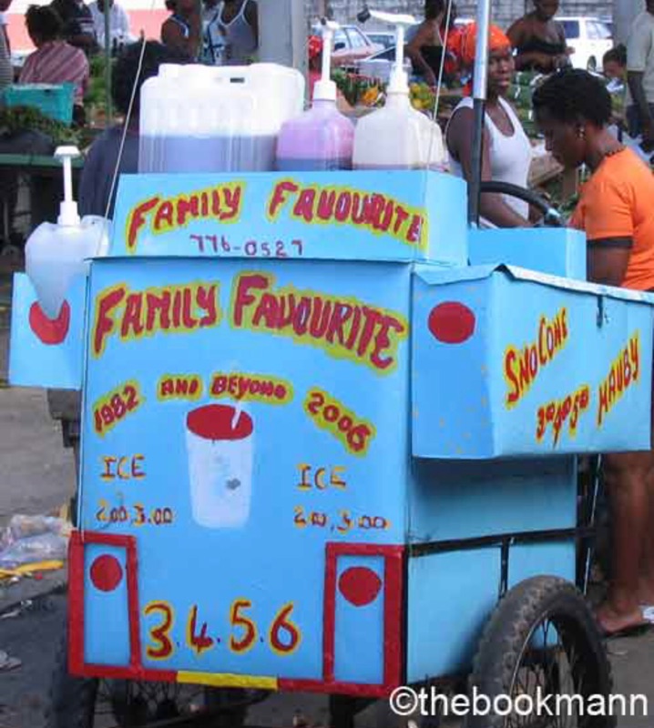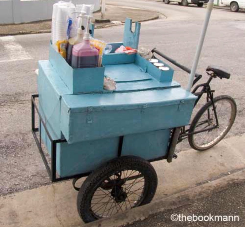 The Snowcone Vendor is a small business person usually making the cart, hand painting it, adding a large bell and placing the whole structure for easy mobility onto a bicycle. What makes it ‘local’ is usually the names given to the cart and the types of syrups that are put into the styrofoam cup of shaved ice - guava, tamarind and the especially exotic, delicious mami cepode.
