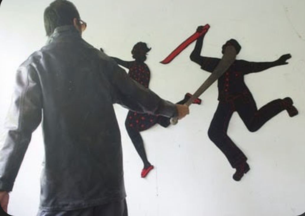 This work was interactive. My partner Richard Bolai holds a machete like the one the man uses to run down the woman he loves.
